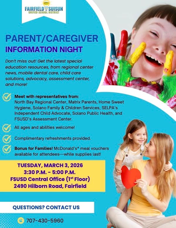 If you are a member of Fairfield-Suisun School District, please join us for this event! We will have a booth to answer any and all questions! Hope to see you there!